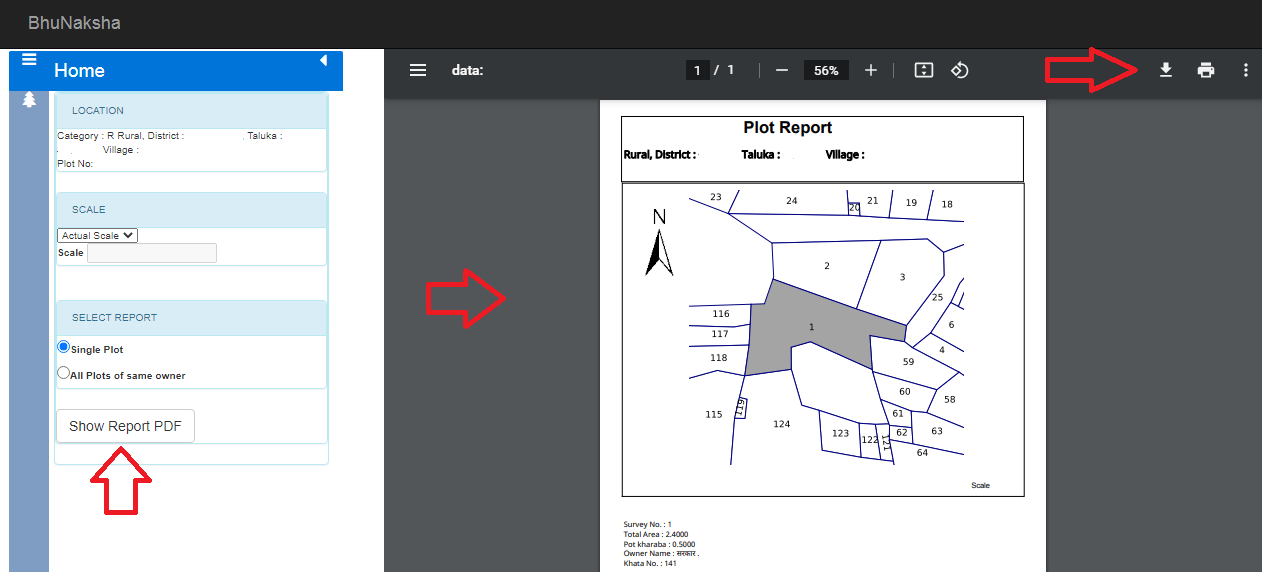 Now, in Plot Info, check and double-check the plot information before clicking the Map Report button. There are two options in the Map Report (Bhulekh Naksha). Choose between Single Plot and All Plots of the Same Owner, and then print or download the pdf file.