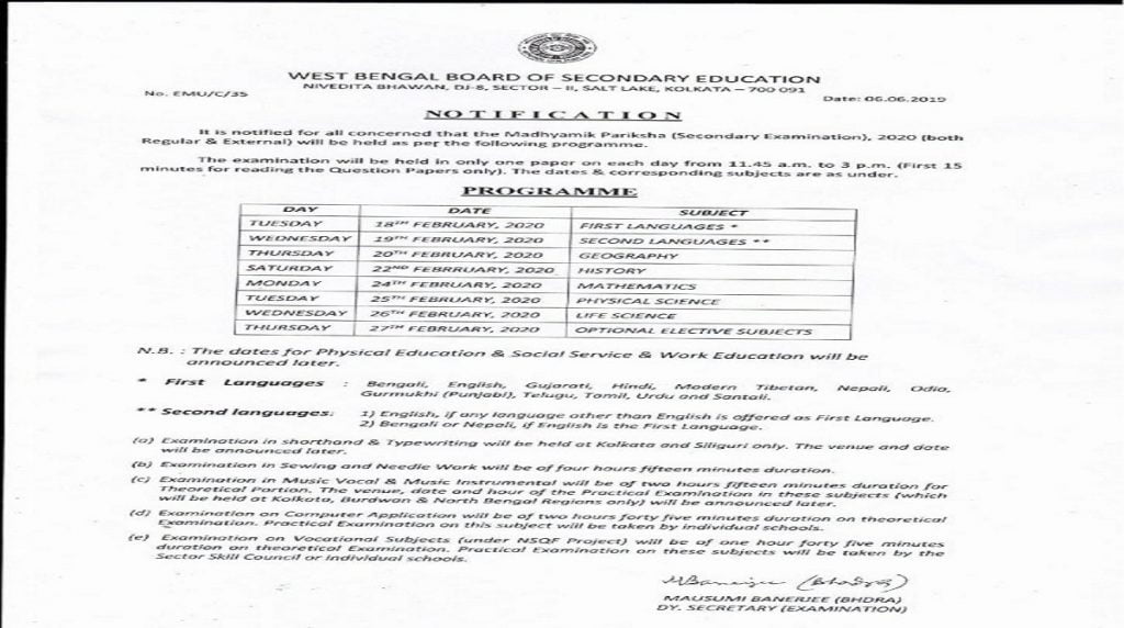 West Bengal Madhyamik Exam Time Table 2025